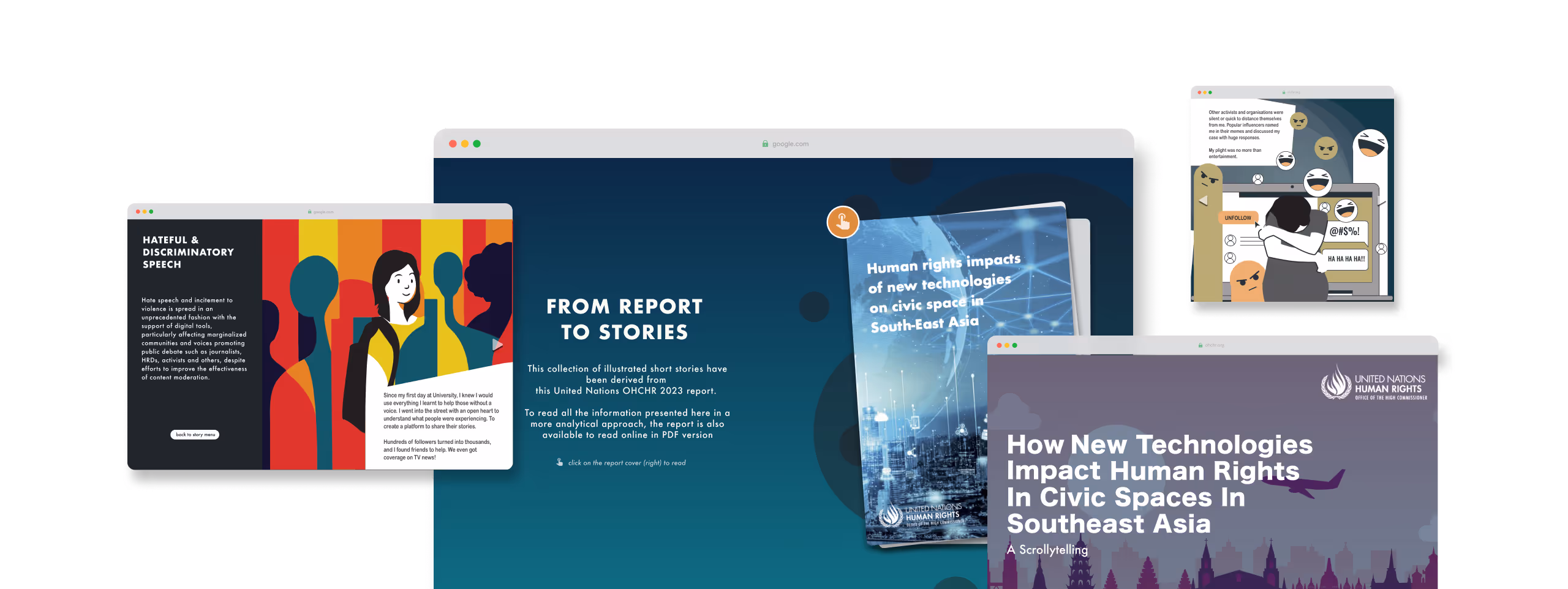 During my internship at Singaporean design consultancy Dilucidar, I designed a web-based interactive scrollytelling experience for the United Nations Office of the High Commissioner for Human Rights (UN OHCHR), Bangkok Office. I translated a dense regional report into a compelling digital narrative spotlighting six key trends in how emerging technologies impact human rights across Southeast Asia.
